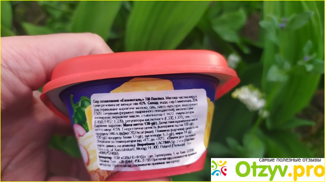 Жирность средняя, 40%. В этом плавленном сырке целых 35% сыра "Эменталь", но этот сорт сыра в чистом виде я раньше никогда не пробовала. Сливочное масло в сверке натуральное, не пальмовый заменитель, и вообще растительных примесей в сверке нет.