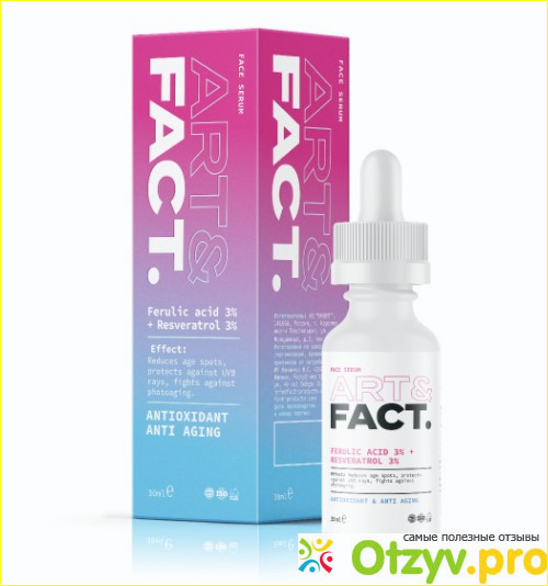 Результата я так и не заметила. В интернете, наткнулась на сыворотку для лица от производителя ART&FACT. Фирма давно на рынке косметического ухода. Отзывы очень хорошие и я рискнула. Рискнула и вот уже твёрдо могу сказать, что всё это было не зря! Мне очень и очень нравится эффект! Пользуюсь 2 месяца, курс составляет не менее 4-х месяцев. Я однозначно доведу курс до завершения, так сказать. Что могу сказать про саму сыворотку. Сыворотка представлена в стекле, хотя на первый взгляд мне показалось это пластик. Но нет, стекло и это очень хорошо, потому как стекло лучше хранит все питательные вещества и витамины, которые находятся в средстве. Наносится сыворотка удобно, с помощью стеклянной пипетки. Аромат нейтральный, наношу по капельке на кожу лица. Сыворотка не течёт, не слипается. Консистенция очень грамотно составлена. Расход экономичный и это тоже огромный плюс. Наношу обязательно на очищенную кожу лица. Феруловая кислота, входящая в состав средства, отлично справляется со своей функцией. Кожа упругая, морщинки постепенно разглаживаются, ушла проблема покраснений. В целом лицо теперь свежее, взгляд даже поменялся. Пропало ощущение стянутости и сухости кожи. Новых морщинок тоже не появляется, значит кожа напитана и уход подобран правильно. Раздражений от сыворотки не возникло. Всё хорошо, буду пользоваться дальше!