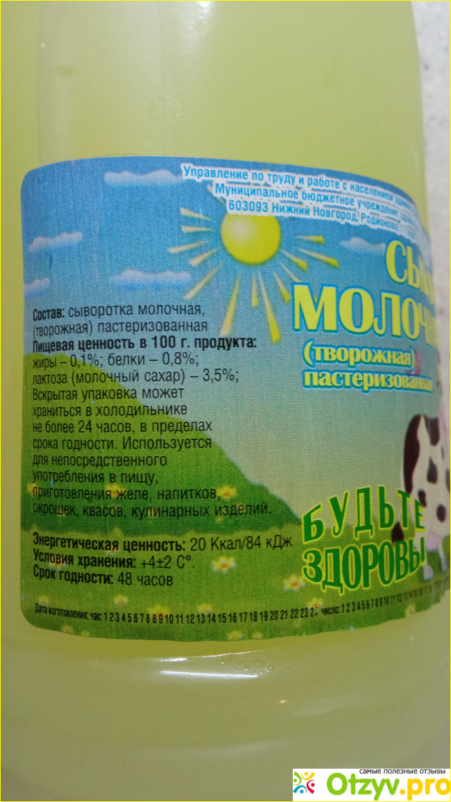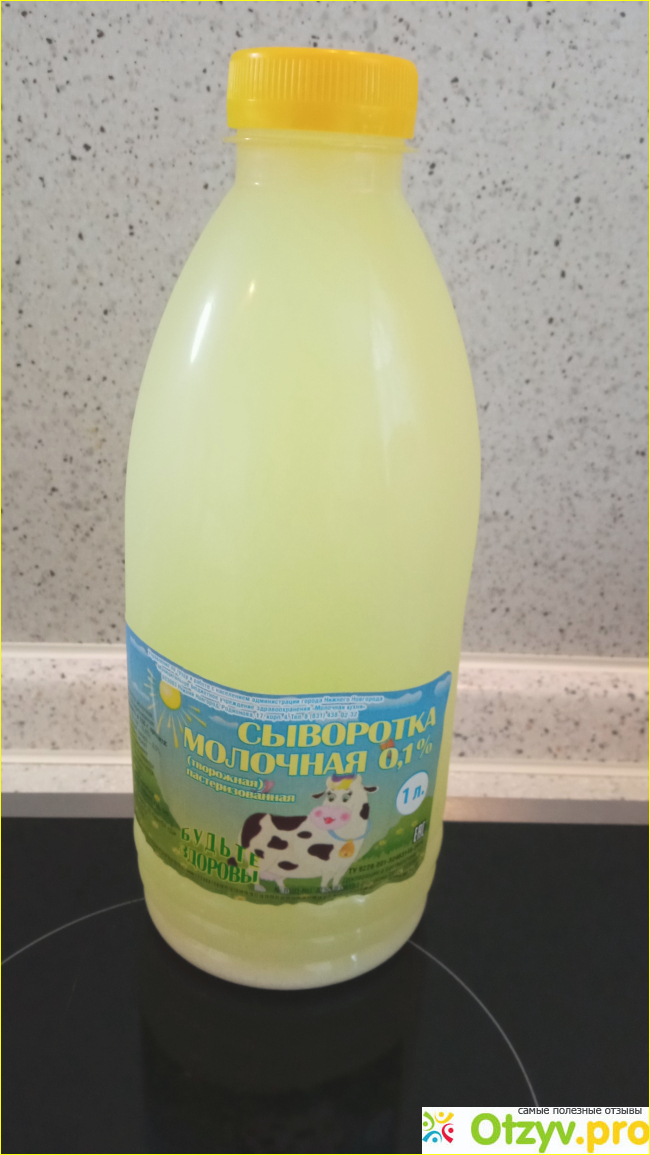 Сыворотка продаётся в литровой пластиковой бутылке. На этикетке корова, написано что 0,1 процента жирности, калорий немного всего 20 Ккал. Срок годности небольшой 48 часов, это говорит о её натуральности, а после открытия всего 24 часа, хранить в охлаждённом месте.