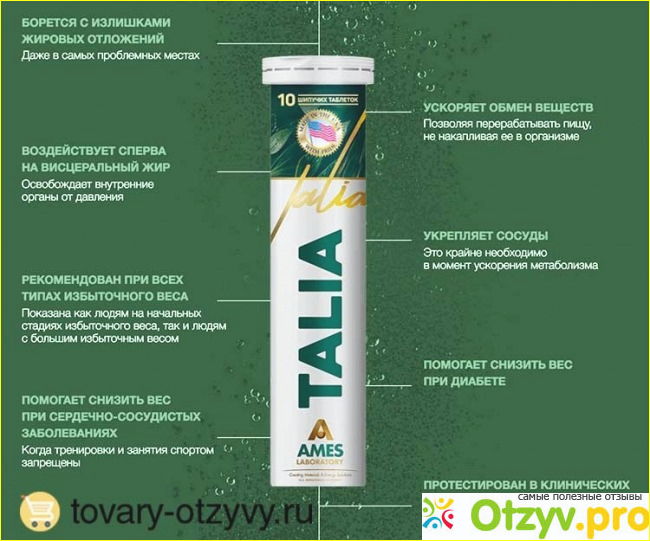 Те, кто не раз сталкивался с проблемой лишнего веса, знают, что лишние килограммы, от которых вот только недавно избавился, снова возвращаются. И это происходит не только из-за неправильного образа жизни. Часто это происходит потому, что средство, которое помогло вам сбросить лишний вес, было с действием вывода лишней жидкости из организма. Что касается таблеток Талия, имеет природные экстракты, поэтому они быстро растворяются внутри. Происходит ускорение обмена веществ. Даже если вы ведете и продолжаете вести пассивный образ жизни, не занимаетесь спортом, часто передвигаетесь на транспорте и занимаете сидячее положение, таблетка, растворившись внутри, за вас ускоряет обмен веществ.