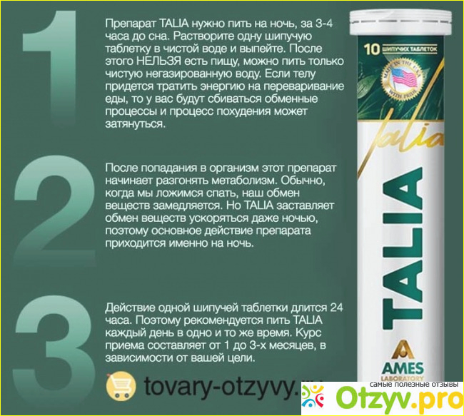 Принимаются таблетки примерно за час до еды. Это делается для того, чтобы они лучше усвоились вашим организмом и запустили какой-то невидимый для нас процесс. Так же на их официальном сайте я нашла подробный состав таблеток Талия. Он конечно же натуральный, но некоторые компоненты которые входят в его состав вообще не имеют ни какого отношения к похудению. Да они ни какого вреда вашему здоровью не принесут, но в тоже время и особенной пользы вы от них не ищите.