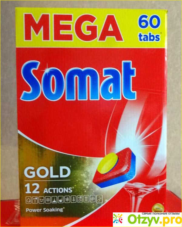 Таблетки Сомат Голд имеют довольно яркую упаковку, на которой представлено большое количество разных функций, пожалуй их даже чересчур много. Всего здесь представлено 12 основный функций. Также отметим, что в них не содержатся фосфаты, а значит они более безопасны для экологии, чем некоторые другие устаревшие варианты.