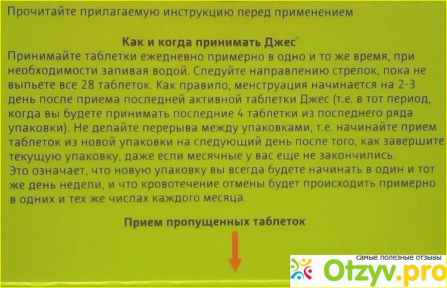 А вообще таблетки трудно забыть выпить, потому что не нужно делать перерывов в приеме таблеток. В бластаре их 28 штук ровно на цикл, 24 активных и 4 неактивных - плацебо (пустышки), благодаря этому не нужно делать недельный перерыв, боясь забыть прием в определенный день. После четвертой неактивной таблетки нужно начинать новую упаковку противозачаточных"Джес". Можно начать пить таблетки на 2-5 день менструального цикла, только не забывайте использовать дополнительный метод защиты от нежелательной беременности в период приема 7 таблеток. Менструация после отмены начинается на 2-4 день неактивной таблетки.