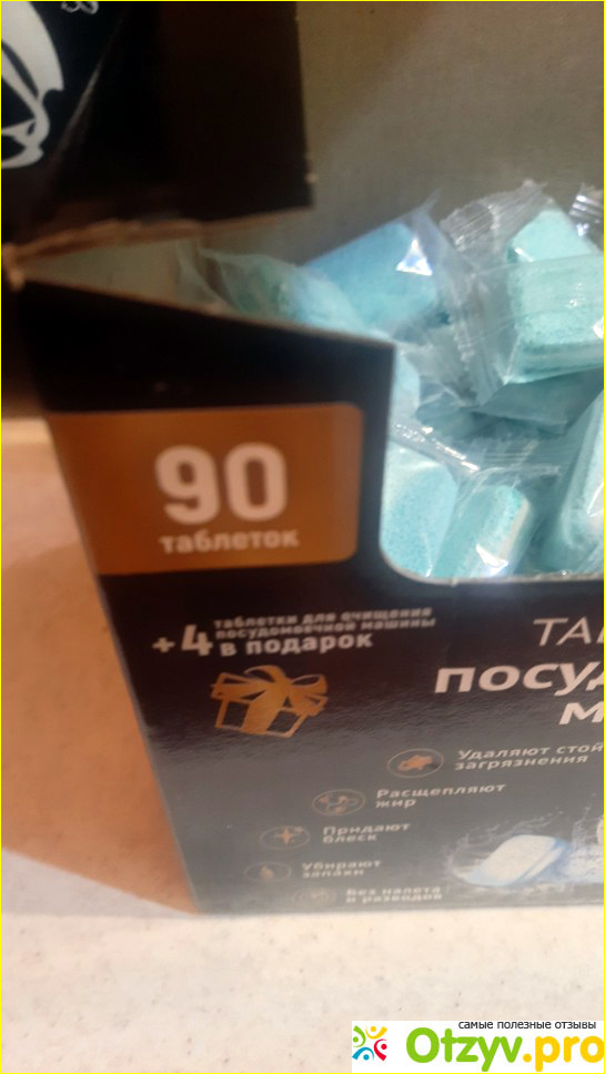 Таблетки «все в одном». Мне это удобно, не нужно дополнительно использовать соль и ополаскиватель. На вид они прямоугольные. Без химозного запаха. Каждая из них упакована в отдельную защитную пленку. Упаковка продуманная. Я, например, держу химию под мойкой, в таком виде сырость им не страшна