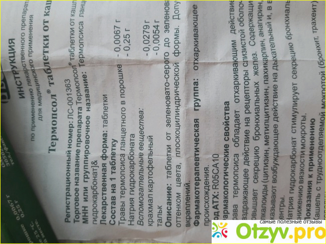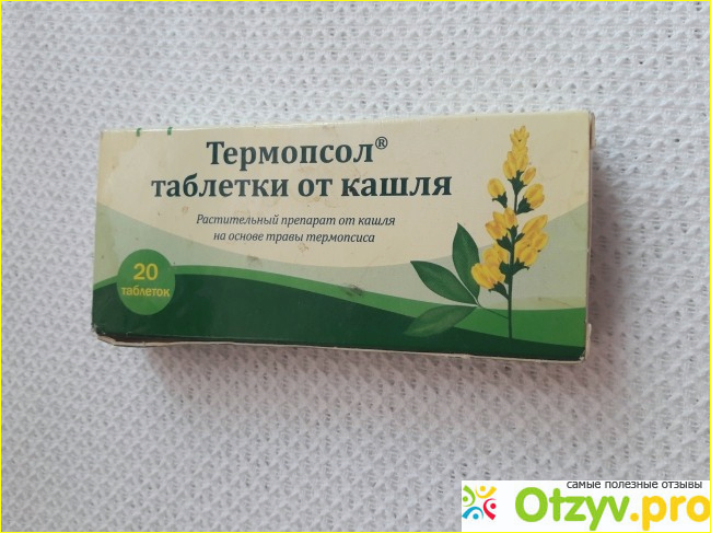 Она представляет собой коробочку, на которой картинка травы термопсиса с желтыми цветами, также написано название препарата и количество таблеток.