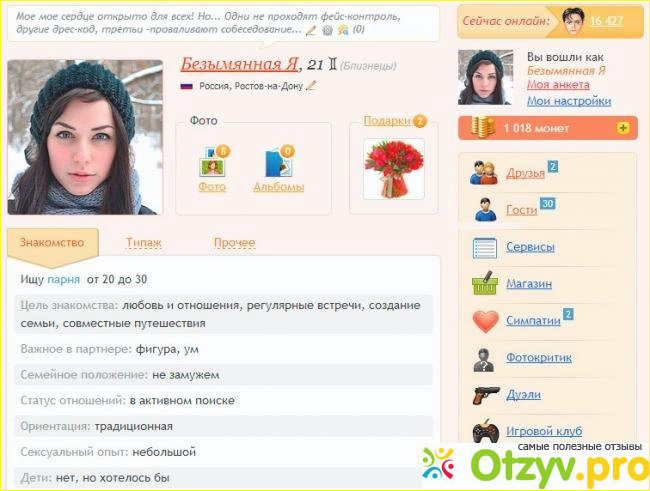 Мне на этом сайте понравилось. Чтобы не было никаких конфузов , указывайте честную информацию о себе.
