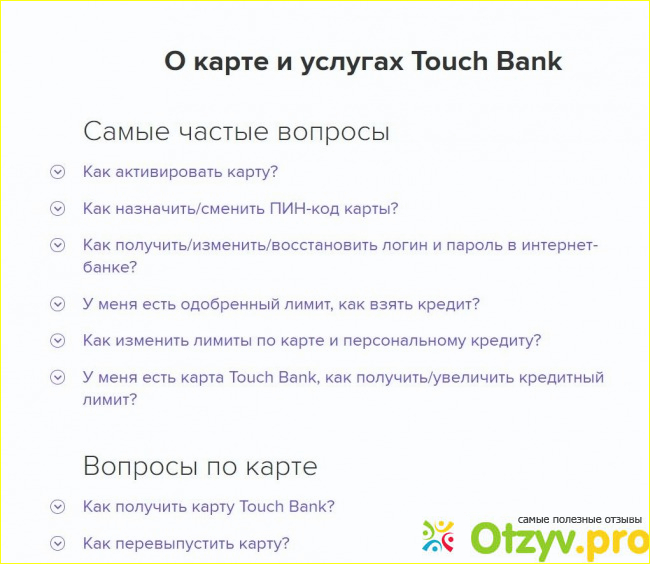 Также очень приятно то, что Тач банк позаботился о своих клиентах и сделал вкладку "Вопросы и ответы". Там можно увидеть самые часто задаваемые вопросы и ответы на них. Это очень удобно, не нужно лишний раз звонить в банк на горячую линию. В основном, в этой вкладке меню много вопросов по картам и по кредитам Тач банка, а также общие сведения.