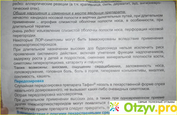 Основной компонент (будесонид) - это синтетический глюкокортикоиам. У него очень ярко выраженно как противоспалительный эффект так и иммуносупрессорный. Так как он в основном попадает на слизистые носа, соответственно практически не попадает в кровоток. Препарат угнетает образование медиаторов, еще является ингибитором высвобождаются биоактивные вещества. Плюс ко всему он действует как средство которое снимает отек за счет сужения кровеносных сосудов в носу, при этом уходит отек. Я ощутила облегчение уже на вторые сутки приема Тафен.