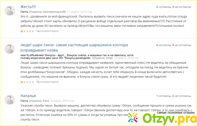То есть понятно, что это не ошибка оператора, а просто вариант дополнительного заработка на пассажирах.Кроме этого, почитала отзывы о приложении - тоже ничего хорошего. Кстати, почему я обратилась в эту службу такси - мне как раз в тот день пришла рекламная рассылка на вайбер, где предлагалось скачать приложение и пользуясь иv ездить с 20% скидкой.. Добавлю - сравнительно высокую стоимость поездки водитель объяснил тем, что у них всегда в наличии есть машины и приезжают быстро. В моем случае это так и было, но судя по отзывам, не всем так повезло.Категорически не рекомендую данную службу такси