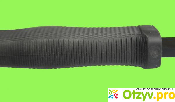 Рукоятка ножа рифленая, изготовлена из кротона - это вид твердой резины. На ощупь - упругая. Снизу и сверху на рукоятку нанесены полосы для более плотного удержания. Задник рукоятки широкий, можно применять для прессования чего-нибудь или для отбивания отрезанной ветки - нож при этом никак не пострадает, всё очень прочно изготовлено.