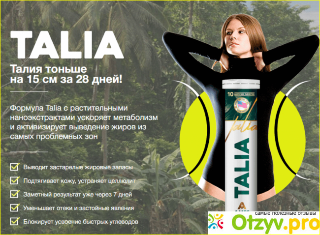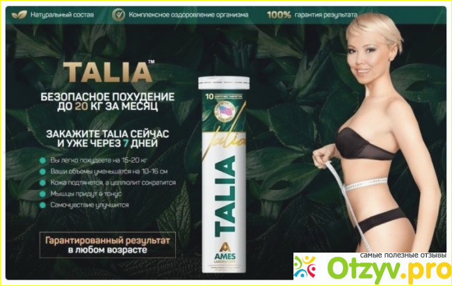 Достоинства данного средства заключаются в следующем (со слов производителя): таблетки не вызывают гормональных отклонений в организме, эффективно помогают расщеплять жировые отложения, способствую эффективному похудению, при этом грудь не уменьшается в объеме. Таблетки Talia помогают укрепить иммунную систему человека, а также способствуют нормализации работы сердечно-сосудистой системы.