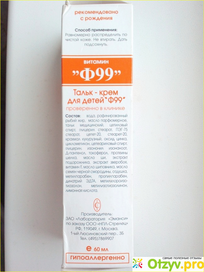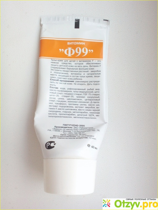 Таким образом, я ставлю плюс за цена, упаковку, удобство в использовании. За состав я ставлю минус (хотя все, пользующиеся этим кремом из тех, кого я знаю, очень довольны кремом). Тем не менее я рекомендую тальк-крем для детей с витамином F "Витамин Ф99", если у вас или у вашего ребенка покраснение или раздражение, думаю, этот крем поможет и вам.