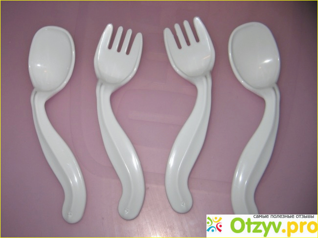 Пришла домой, открыла и увидела, что тарелка снизу оборудована присоской, что позволяет ей намертво присосаться к столу, меня это обрадовало, так как моя доченька, в порыве своих каприз может просто шибануть тарелку на пол, что очень раздражает меня, и приходится отмывать и ребенка. Снизу есть язычок, благодаря, которому она без всяких проблем отсоединяется от стола. Ложечки и вилочки, тоже очень замечательный, они изогнуты, что позволяет малышу, учится самому кушать, и при этом у них лучше полчается кушать именно этими приборами, чем обычными. Меньше всего вываливается из ложки, не дойдя до рта. В наборе две ложки и две вилки, две пары идут для правши, а другие две для левши. С вилками мне не очень повезло, так как в упаковке оказалось 2 для левши, мой ребенок кушает правой рукой. Поэтому она просто с ними играет, а вот ложка была и для правши и для левши. Дочке нравится самостоятельно из нее пробовать кушать. Я даю эту ложку ей, а себе беру обычную ложку. И так мы с ней кушаем, одну ложку дает мама, а одну ложку кушает сама дочка.