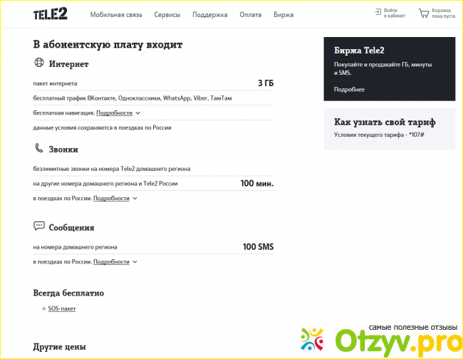 Ну и понятно, что за такие деньги нам много не предложат. Самое привлекательное- это безлимитные разговоры с абонентами Теле2. Так что если у вас родня и друзья в основном подключены к Теле2, то такой тариф может оказаться подходящим.