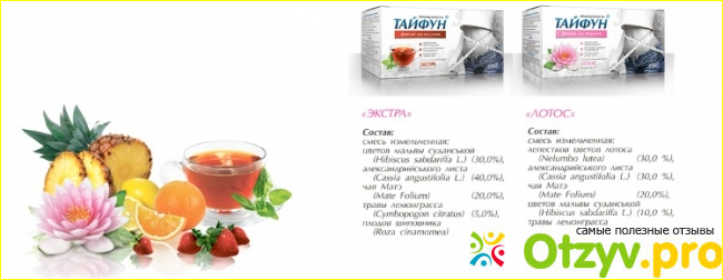 Относится он к биологически активной добавке, имеет хороший стабильный эффект. Главной его задачей является очищение кишечника и всего организма от накопившихся токсинов и шлаков. Затем под его воздействием происходит ускорение обменных процессов, которые происходят в организме. Весь этот эффект обеспечивается благодаря входящим в состав компонентам, в частности биофлавоноидам растений. По желанию можно приобрести чайный напиток в двух вариантах - одноразовые пакетики и рассыпной. Производитель обещает, что данный напиток поможет избавиться от 5 до 10 кг за месяц. Очень важно принимать этот напиток правильно, с соблюдением всех установленных дозировок. В составе можно найти: экстракт сенны, экстракт мате, каркаде и плоды шиповника. Существуют такие чаи, как Тайфун Экстра, Тайфун лотос. В продаже можно найти напиток с разными вкусами, которые получают путём добавления естественных ароматизаторов. Кроме того, что происходит сжигание жира, ещё организм наполняется минеральными веществами и витаминами. Очень важно для этого напитка - предотвращение обезвоживания и авитаминоза.