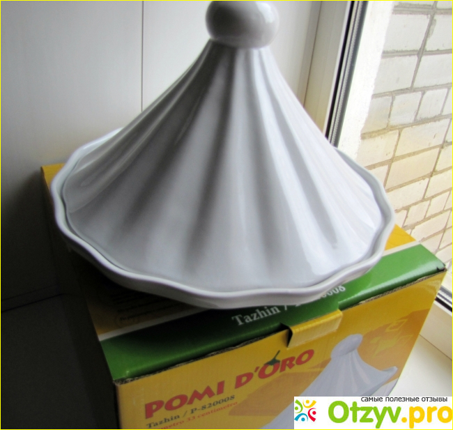Тажин Pomi d'Oro выглядит красиво и приготовленное блюдо можно подавать на стол прямо в этой широкой тарелке (диаметр 33 см), сняв крышку.