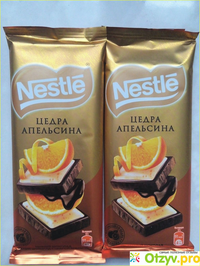 На плитку тёмного шоколада нанесены пластинки белого шоколада, в которой и присутствует цедра апельсина. Смотрится красиво, богато. Правда плитка уменьшена весом, отличается от стандартного, вес составляет 85 г.