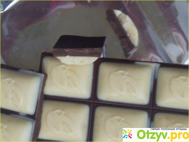 Пробуя шоколад, можно ощутить очень маленькие кусочки цедры апельсина, они даже похрустывают на зубах, но при этом не мешают и как-то добавляют особую "изюминку".