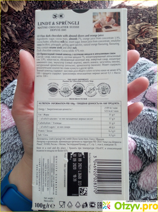 Превосходный тёмный шоколад с кусочками миндаля и апельсиновым соком. Если вы сладкоежка и не можете прожить и дня без сладкого, то это шоколадка для вас.