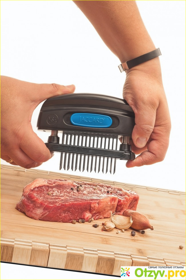 Что же это за зверь такой? Тендерайзер - это механическое устройство для прокалывания мяса. Оно имеет пластиковый корпус, снабжено металлическими штырями. При надавливании на рукоять штыри выходят наружу и прокалывают мясо. То есть тендерайзер - это замена молотка для отбивания.