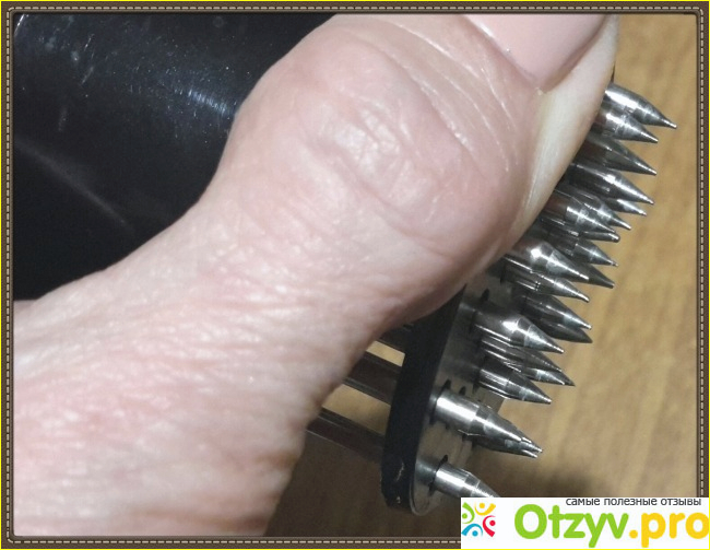 Все сведения об этом товаре написаны прямо на коробке. Ничего сложного в использовании нет. Надо просто разместить это устройство на кусок мяса и нажать. Острые заострённые зубцы свободно входят во внутрь мясного куска, отлично отбивают мясо и автоматически возвращаются на место во внутрь устройства. Зубцы очень острые и при мытье этого тендерайзера надо быть осторожнее.
