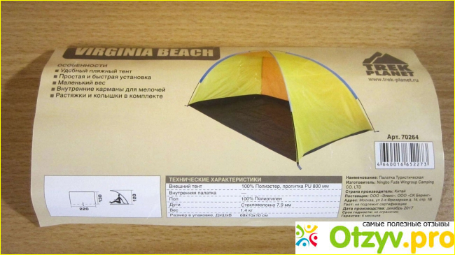 Водостойкость материала, согласно заявлению производителя, составляет восемьсот миллиметров (для сравнения: у туристических палаток этот параметр варьирует от восьмисот до трех тысяч миллиметров водяного столба). Так что тент обеспечивает укрытие от ветра и солнышка в обычных (не экстремальных) условиях, например на пляже или лесной лужайке при хорошей погоде.