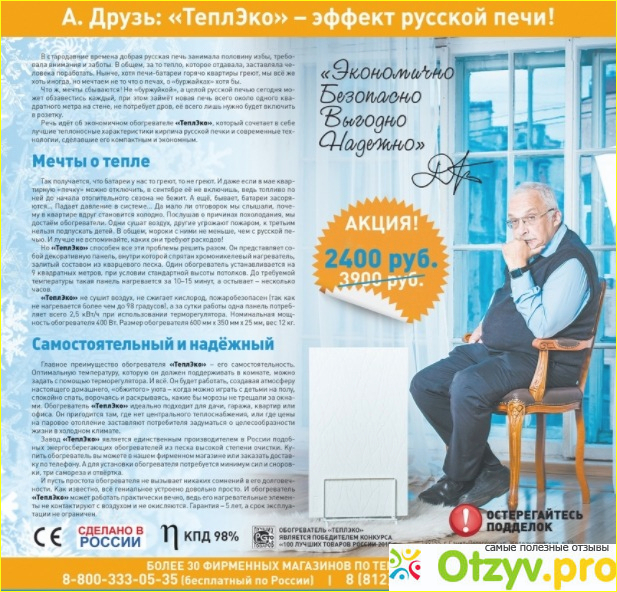 Кварцевый обогреватель ТеплЭко это монолитная панель толщиной всего три с половиной сантиметра, длиной шестьдесят и высотой тридцать пять сантиметров. Внутри находятся нагревательные элементы мощностью всего четыреста ватт. Обогреватель упакован в пластиковый пакет, который, в свою очередь помещен в картонную коробку на которой, кроме названия самого изделия имеются логотипы всевозможных наград, которые получил этот нагреватель, а также надпись "СДЕЛАНО В РОССИИ".