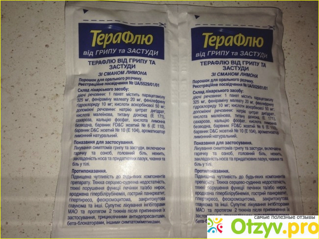 У меня всегда есть в запасе несколько пакетиков "горячих напитков" на основе парацетамола. Сейчас в наличии "ТераФлю от гриппа и простуды со вкусом лимона".