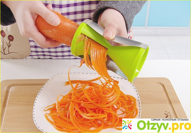 Для того, чтобы было удобнее готовить и пальцы были бы в безопасности, лучше всего использовать крупную морковь, которая хорошо размещается в держателе. Это позволяет также получить шинковку хорошей формы.
