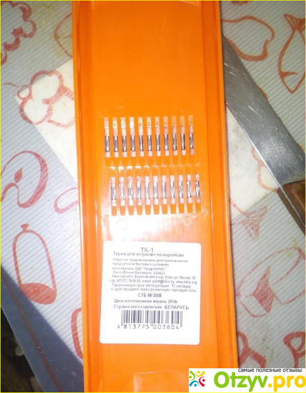 Тёрка белорусского производства страны. Кроме серьёзных мышечных усилий, пользоваться ею несложно, только в процессе работы забиваются ножи - часто приходится останавливаться и очищать поверхность терки от натертых овощей.