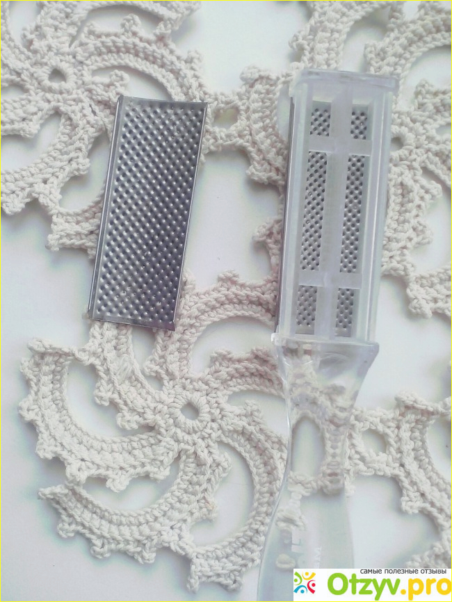 Представляет она из себя пластиковую палку, с двух сторон которой прикрепляются две металлические пластины с острыми выпуклостями как у кухонной терки. Именно данные пластины при соприкосновении с кожей пяток снимают с нее грубый и сухой слой, отшаркивают все неприятные частички. Весь "мусор" скапливается внутри и после снятия пластинок его можно оттуда вымыть.
