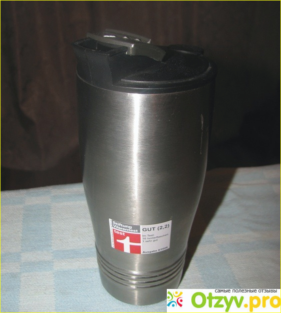 Моя термокружка приобретена в Европе, в Греции, производство, если верить штрихкоду - Германия, изготовлена она из нержавейки, крышка - из черной пластмассы. Крышка закрывается довольно плотно, но не герметично, в ней есть отверстие, через которое можно пить. Наливала в термокружку чай холодными вечерами в греческих горах, чтобы сохранить тепло, остывал чай довольно быстро, т. е. термокружка хранит тепло намного хуже, чем термос. Стенки у нее двойные, руки не обжигаются, и думаю, это единственное ее преимущество, кроме того, что из нее можно пить.