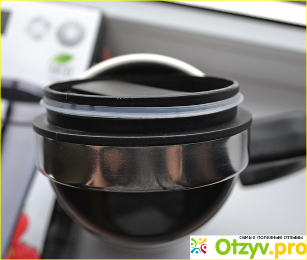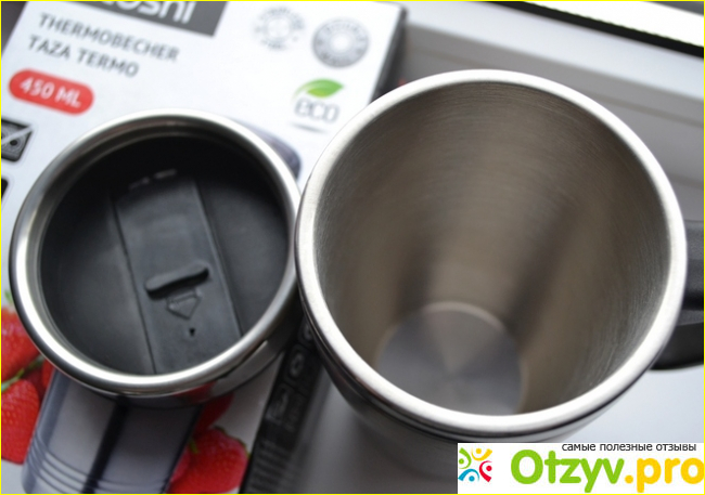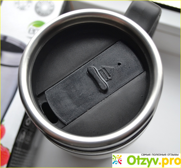 Крышка, к большому сожалению, не имеет резьбы, а просто вставляется сверху. Это вызывает определенные опасения, но никто и не предполагает, что Вы будете носить кружку на дне сумки, например. Она должна эксплуатироваться вертикально. Тогда крышка точно не вывалится.