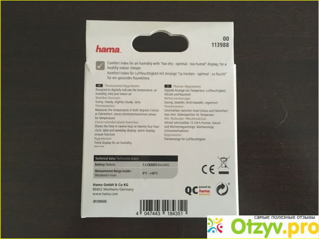 Прибор производится под немецким брендом «Hama GmbH», страна изготовления Китай.