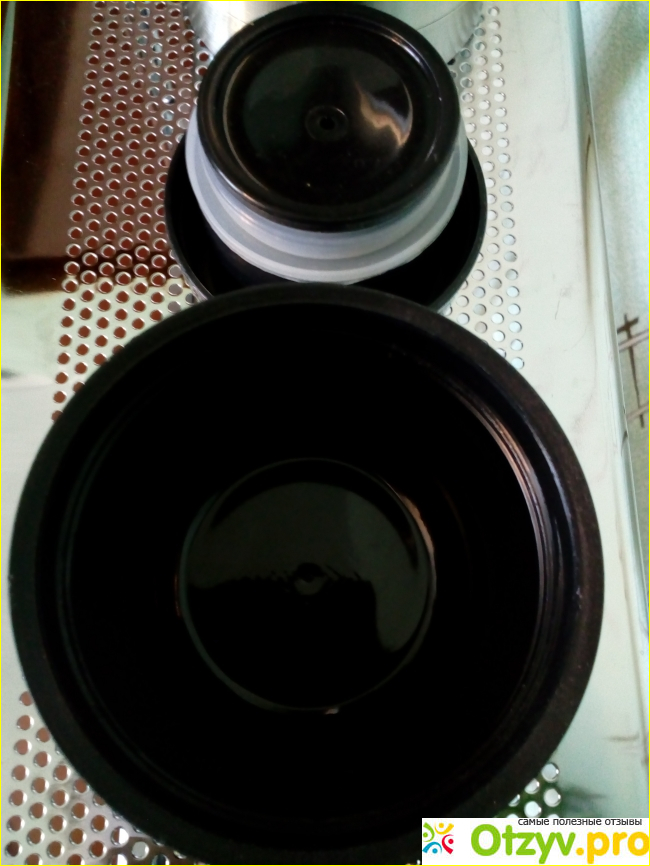 3. Термос имеет две крышки. Первая - крышка-клапан, изготовленная из пластмассы. Такая крышка очень удобна в использовании: можно нажать на клапан и через отверстие перелить жидкость в кружку, стакан или другую ёмкость. Крышка закрывается простым поворачиванием по часовой стрелке по спирали. Вторая (внешняя) крышка изготовлена из нержавеющей стали, внутренняя часть её - пластмасса. Она также закручивается обычным способом. Её можно использовать в полевых условиях вместо стакана.