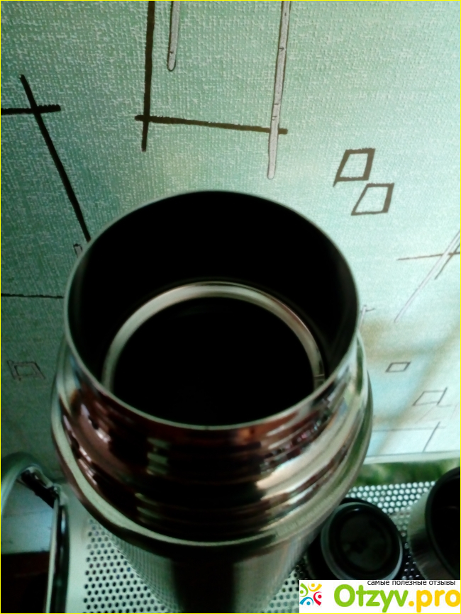 Термос без стеклянной колбы я купила в первый раз. Внутренняя ёмкость такого термоса изготовлена из нержавеющей стали, таким образом, устранён очень существенный недостаток - колба не разобьётся и не лопнет.