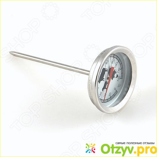 нет и ознакомившись с отзывами, я остановилась именно на Irit IR-9101. Он выполнен из нержавеющей стали, дисплей - из жаропрочного стекла. Вес изделия всего 50 гр, что также есть преимуществом - он очень легкий и компактный. Диаметр стекла - 5 см, длина металлического штекера - 11 см. Под стеклом схематически изображены разные животные, символизирующие виды мяса и некий циферблат с градусами - очень легко по всему этому ориентироваться и определять температуру и степень готовности блюд. Выглядит данный термпощуп, как гвоздь. Очень легок в использовании - вставляется в самое толстое место мясного или рыбного куска и ждешь. Также легко определять температуру, например, молока и момент перед закипанием. Кроме того, его удобно с собой брать в вылазки на природу - термощуп Irit IR-9101 отличный помощник и при приготовлении шашлыка, овощей, мяса, рыбы гриль.