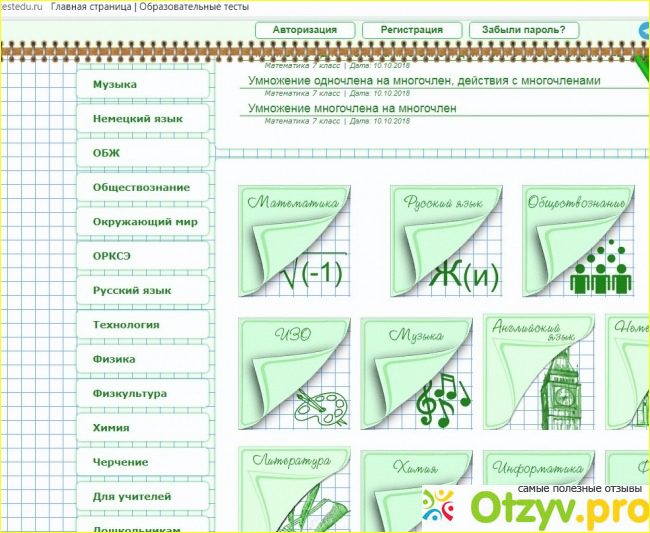 На главной странице, по левому столбцу указаны предметы по которым здесь можно найти тесты. Среди предметов есть: обществознание, информатика, география, физика, химия, технология, русский язык и многие другие.