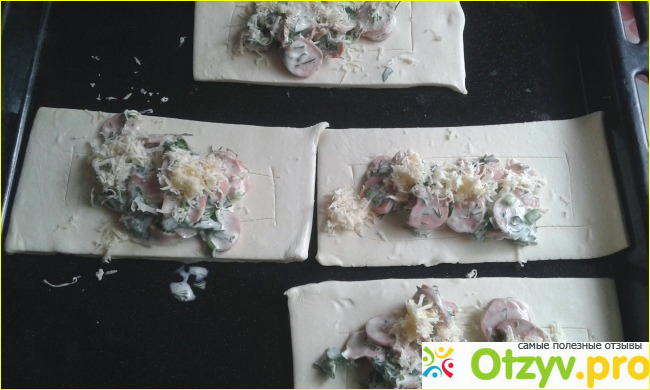 Беру один пласт и разрезаю на две части. Делаю небольшие разрезы в виде окна и на эти прямоугольники выкладываю начинку. Начинка может быть как вегетарианской так и для любителей мясных продуктов или рыбных. Я пробовала просто несколько.