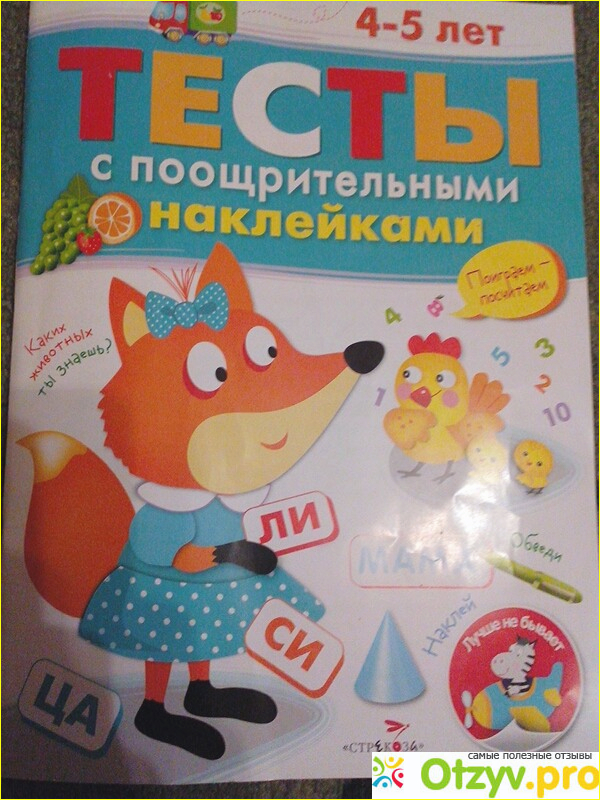 Дочка любит сама покупать себе книги. Ее привлекают яркие издания, где много крупных картинок. Так, недавно ездили в гипермаркет Лента за продуктами, и дочка в отделе детских книг выбрала себе Тесты с поощрительными наклейками.