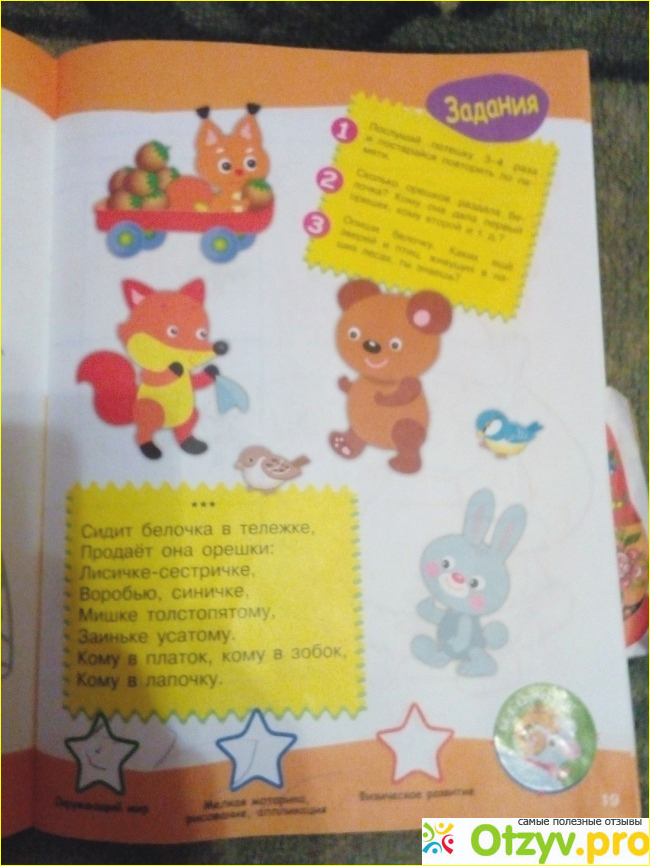 Большое преимущество для моей дочери это наклейки. Их 2 вида, одни наклейки для тех или иных заданий, другие поощрительные. Их надо клеить в конце задания, которое ребенок выполнил сам. Ребенка это подстегивает. Стоит эта книга дороговато, 300 рублей. Дороговато для такой тоненькой книги. Все равно буду рекомендовать эту книгу, детям очень нравится подобные красочные книги да еще и с наклейками.
