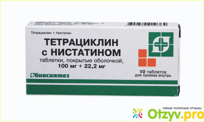 Одно из побочных проблем, которые вызывает Тетрациклин – это нарушение нормальной микрофлоры кишечника. Такое может быть при лечении любым антибиотиком. Чтобы предотвратить этот процесс, иногда назначают Нистатин: одну таблетку Нистатина (противогрибковое средство) нужно принять одновременно с таблеткой антибиотика (в данном случае Тетрациклина). Иногда это позволяло предотвратить развитие грибковой инфекции, в том числе вагиноза у женщин ("молочница"). Поэтому было разработан препарат, который включает в себя этот компонент. На упаковке так и написано – Тетрациклин с нистатином.
