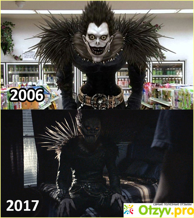 Сюжет такой же. И герои те же. Но тетрадь уже исписана, и в ней есть предупреждение. Есть много правил, как писать. И в этом фильме сцены смерти намного кровожаднее, чем в японском. Сравните, сердечный приступ в Японии и отрезание головы лестницей в США. Здесь бог смерти является негативным героем, в японском варианте он всего лишь наблюдатель.