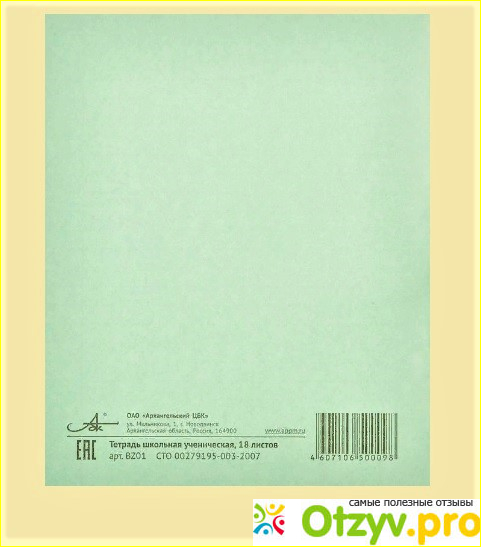 Обложки у тетрадок Архбум классические – приятного для глаза зеленоватого цвета с блоком для подписи, расположенным в центре. Небольшой логотип в правом верхнем углу указывает на принадлежность к старейшей российской марке и ничуть не мешает использованию даже в учебных заведениях со строгими требованиями к канцтоварам. Обратная сторона также минималистична, там нет никаких картинок или длинных текстов, только необходимая информация о производителе и его продукте.