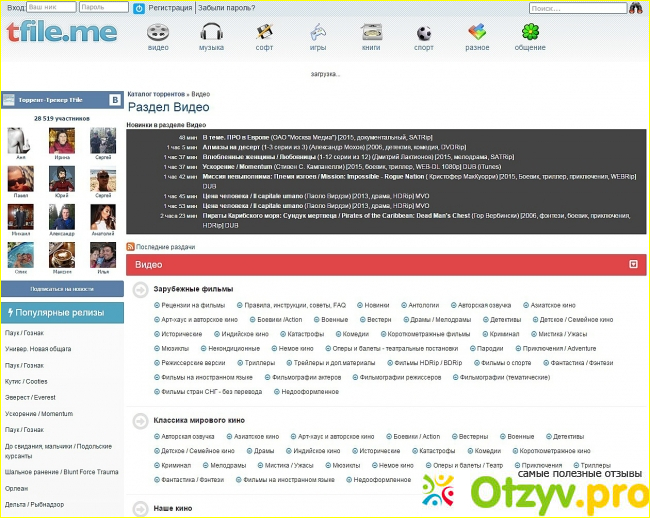 - имеются подразделы: зарубежные фильмы, наше кино, мультфильмы, документальное видео, аниме, приколы, сериалы, советское кино, советские мультфильмы, отечественные сериалы, HDTV/DVD.
