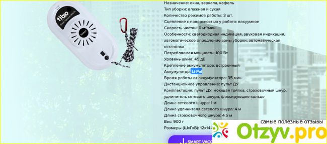 Размеры зоны уборки он определяет самостоятельно. Имеет как цветовую, так и звуковую индикацию. Аккумулятор литиево-полимерный встроенный. От него может быть работа 35 минут. Если прибор функционирует от сети и при этом выключили электричество он еще 30 минут сможет нормально работать.