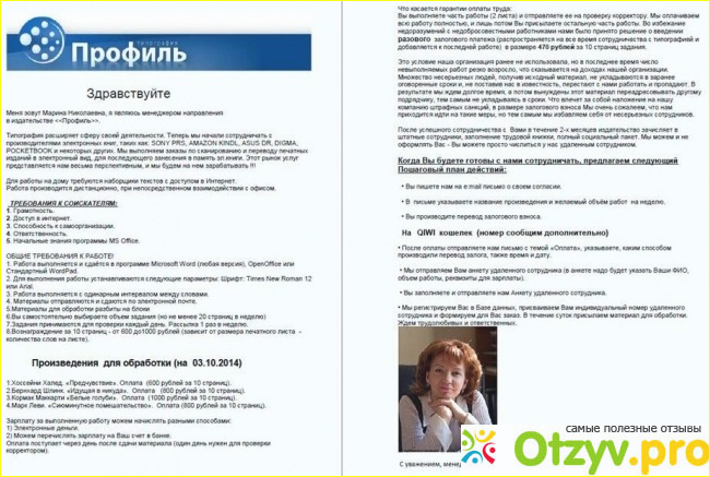 Описано там все было грамотно, подробно и, довольно, привлекательно правдоподобно. За исключением одного нюанса - перед тем, как со мной начнут работать, мне нужно отправить платеж в 470 рублей, как гарантию моей добросовестности, так как фирма высылает оплату за всю работу, а многие нечестные наборщики текста не заканчивают свою работу и пропадают, а "бедная" фирма без конца терпит убытки. В общем сразу мне это не понравилось, но дабы развеять сомнения написала ответ этой Марине, что меня не устраивает такой подход, и скорее я соглашусь на вычет из первой зарплаты этой суммы, чем буду отправлять сама. На что мне ответили: "Я Вас понимаю! Просто мы работаем с техотделом по договору субподряда. Перевод текстов на русский и отправка задания, их прерогатива. Они не отправляют задание без пополнения их счета!" Только причем тут я!? Это обязанность работодателя оплачивать труд, а не моя. К тому же от того, что я ОДИН раз перешлю деньги, что поменяется потом? Как потом они будут работать?