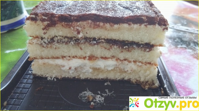 Три бисквитных коржа прослоены тонким слоем крема, верхний еще и посыпан кофе и какао. Режутся торт хорошо, не крошится, не разваливается. Бисквит нежный, воздушный, просто тает во рту. Неповторимое наслаждение! Тортик умеренно сладкий, не приторный. Он прекрасно подойдет и к чаю, и к кофе.