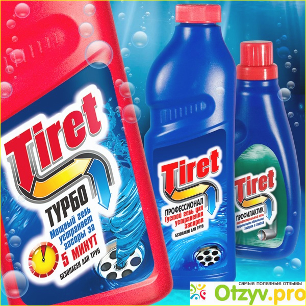- за десять минут избавляет ванну или унитаз от засора даже в самых застарелых металлических трубах, чем способно похвастатить далеко не каждое чистящее средство против образования и борьбы с ужаснейшими засорами. Тирет избавляет просто "на ура" также от засоров из-за обильного скопления волос, что частенько возникает по причине домашнего окрашивания шевелюры.
