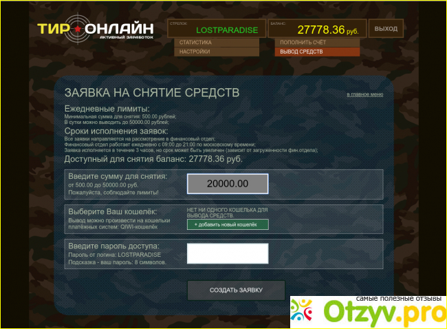 Я не вкладываюсь, принципиально реальными деньгами. На нормальных сайтах и так можно, хоть не много, но без вложений заработать! Начал стрелять. На бонусные 600 настрелял 1000 почти. Не плохо думаю. Выведу. Ан нет. Оказывается нужно киви подтвердить. А для этого реальные рубли надо им перевести! Деньги не большие, но жалко, блин! Решил по стрелять ещё. Благо через сутки зачислили призовые. На 1000 настелял около 2000! Ну и пошло. Выходные, делать нече! В общем, стал я миллионером!!!!! См ниже. Ну вот теперь можно рискнуть думаю. Вывести можно не более50000р в сутки! Отлично! Больше не надо. За 200рублей то! Но душа сопротивляетса, не надо говорит! Заплатил! Пришло сообщение, что через сутки 50000р поступят мне на счет!!!! Оооооо! Неужели!!! Классс!!! См ниже. Как бы не так! Через сутки письмо, чето у них там поменялось, деньги они мне вернули на игровой счет!!!!! А 200р на киви, по бороде! Короче, мне опять надо подтвердить кошелек!!!! Опять надо платить реальные рубли! Написал в поддержу, тишина! Не поддавайтесь на искушение! Поверте! Вас тоже обуют! Вы не будете тем, кому повезет!